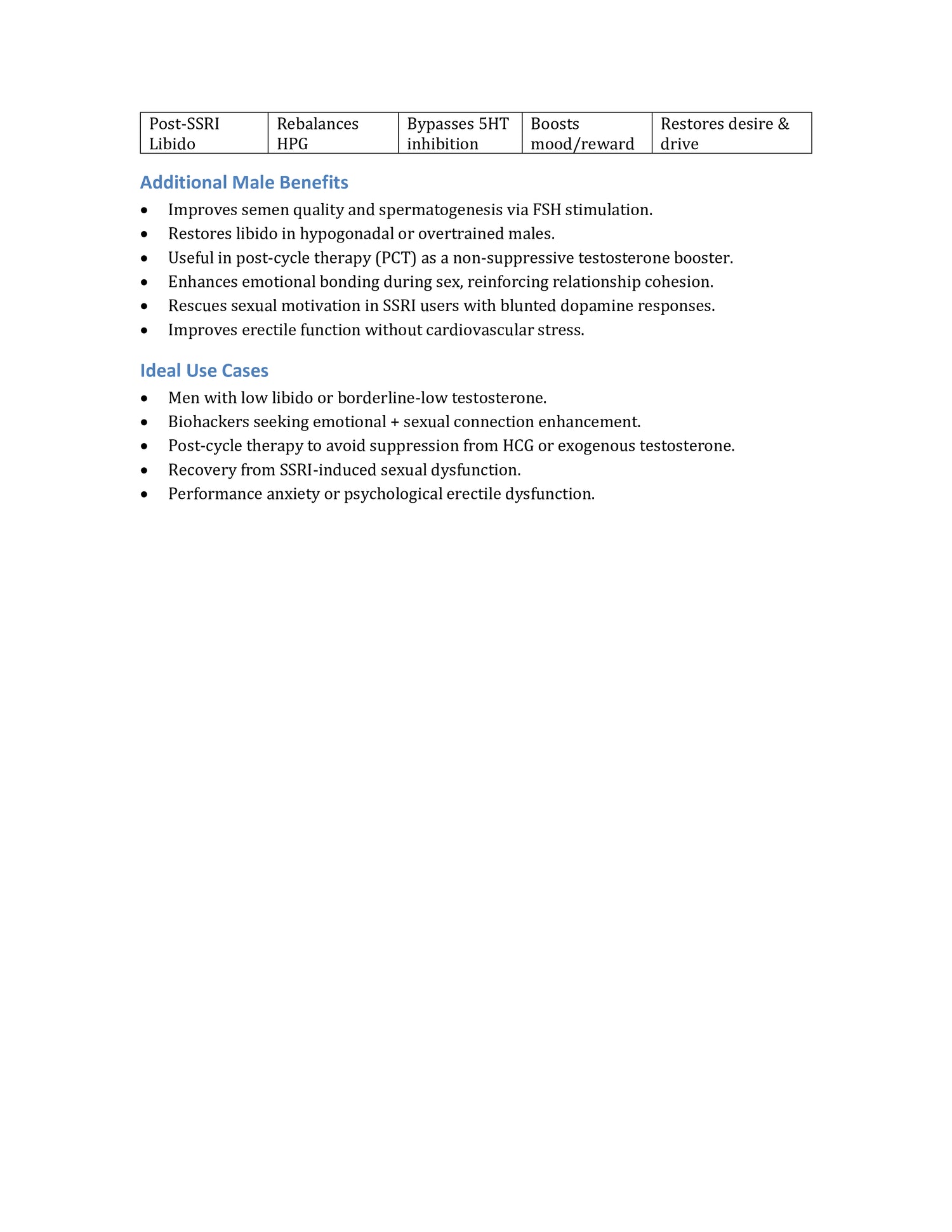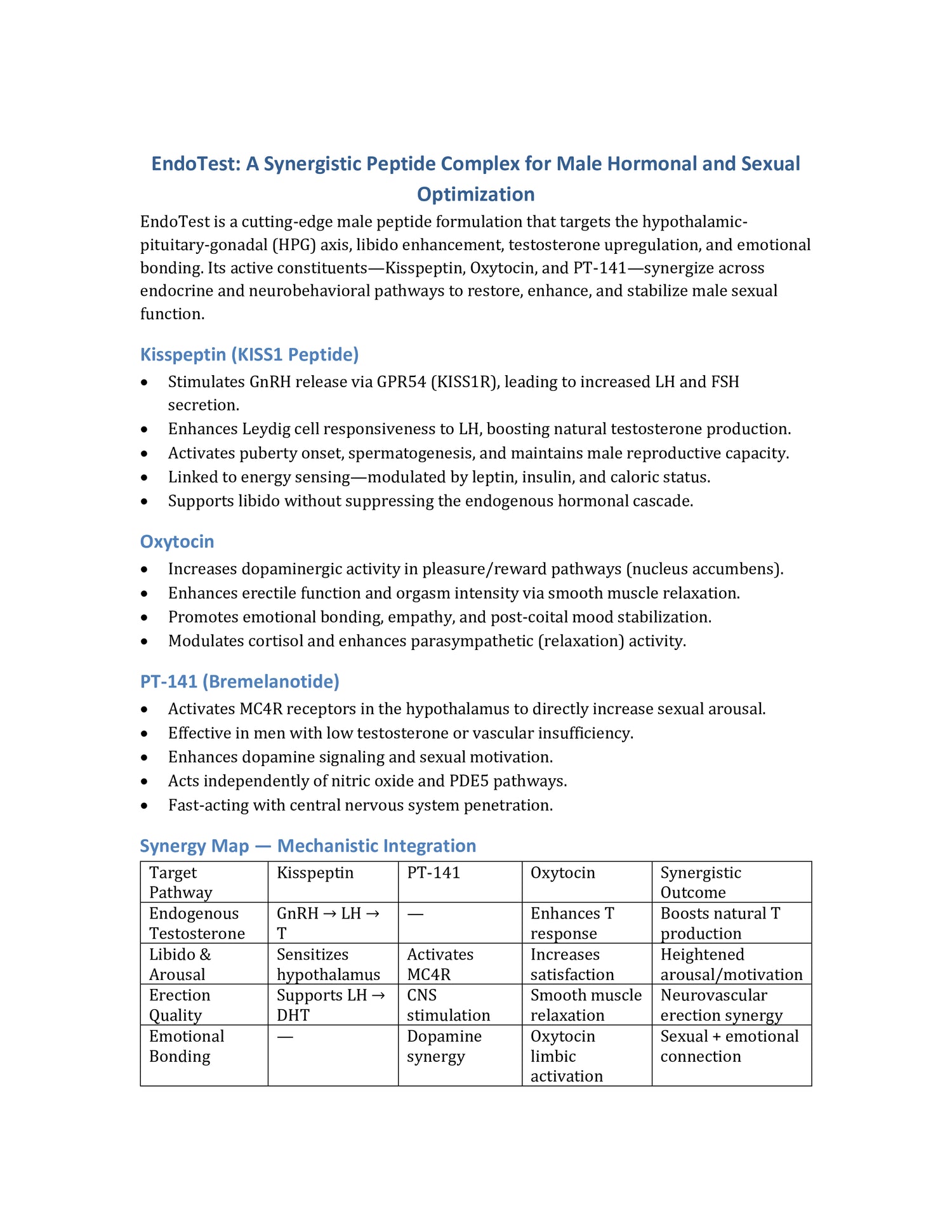 pituitary-gonadal (HPG) axis, libido enhancement, testosterone upregulation, and emotional bonding. Its active constituents—Kisspeptin, Oxytocin, and PT-141—synergize across endocrine and neurobehavioral pathways to restore, enhance, and stabilize male sexual function.