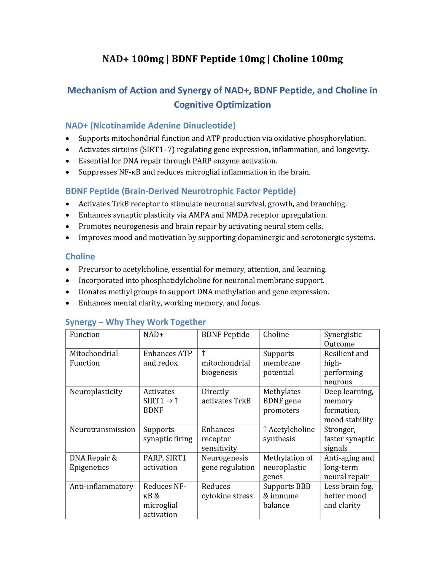 NAD+ 100mg | BDNF Peptide 10mg | Choline 100mg