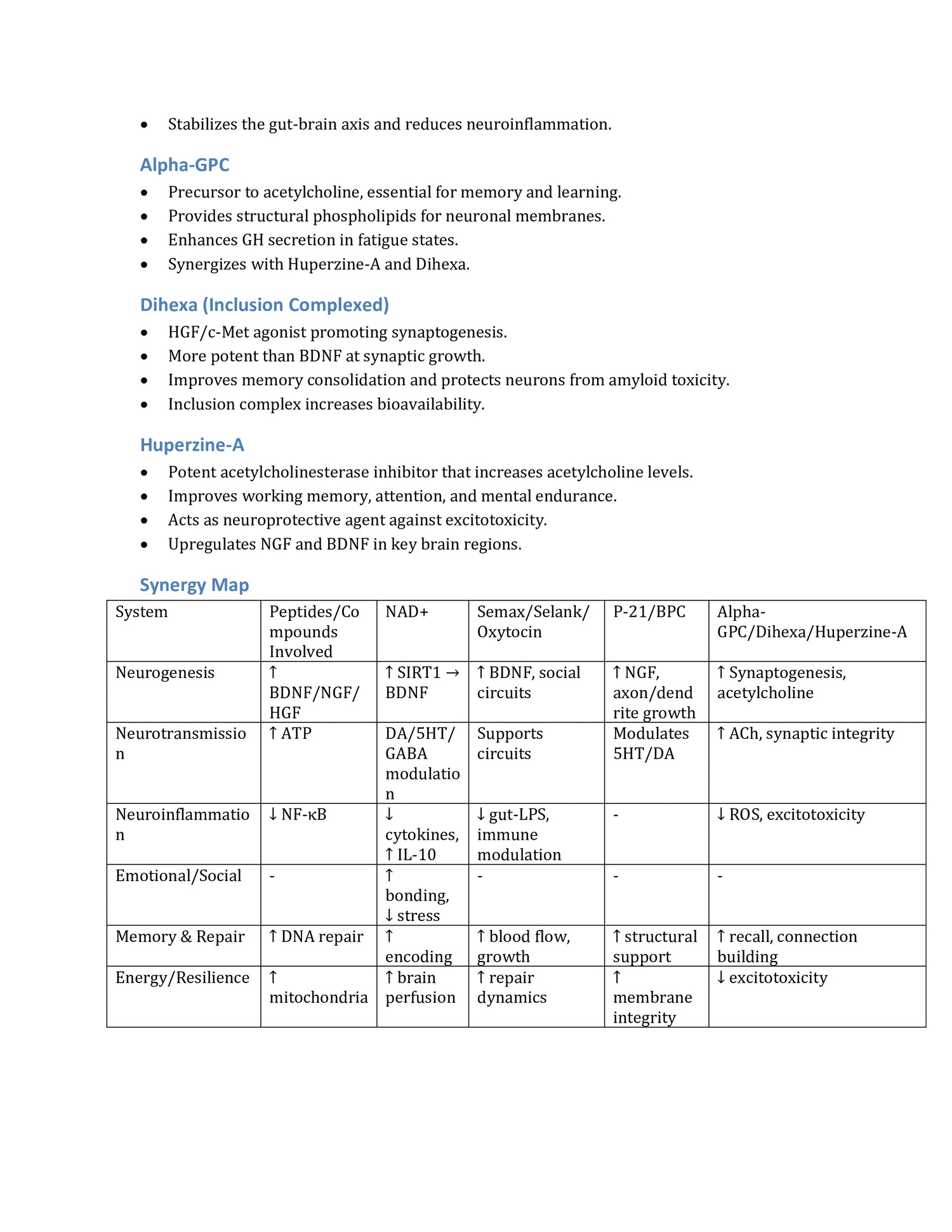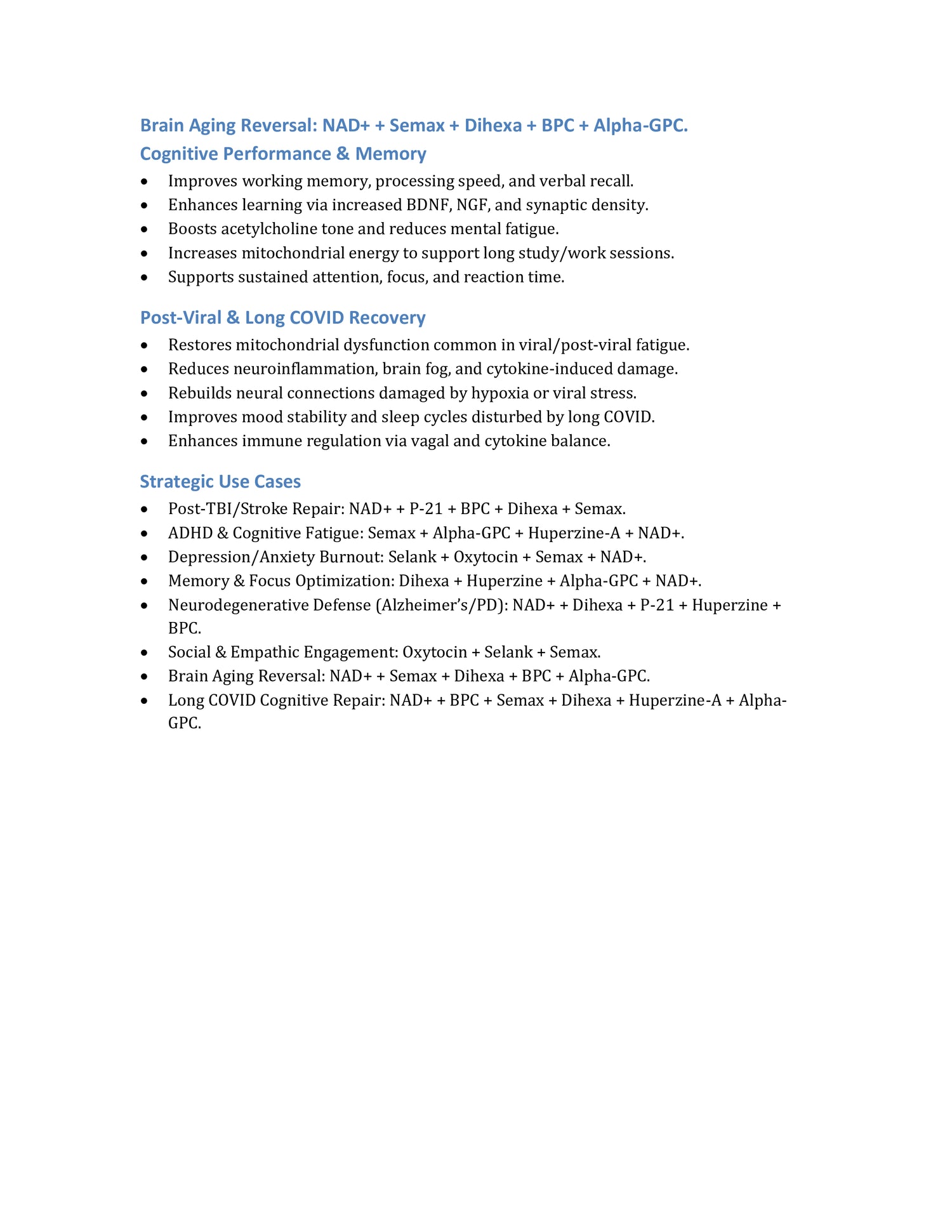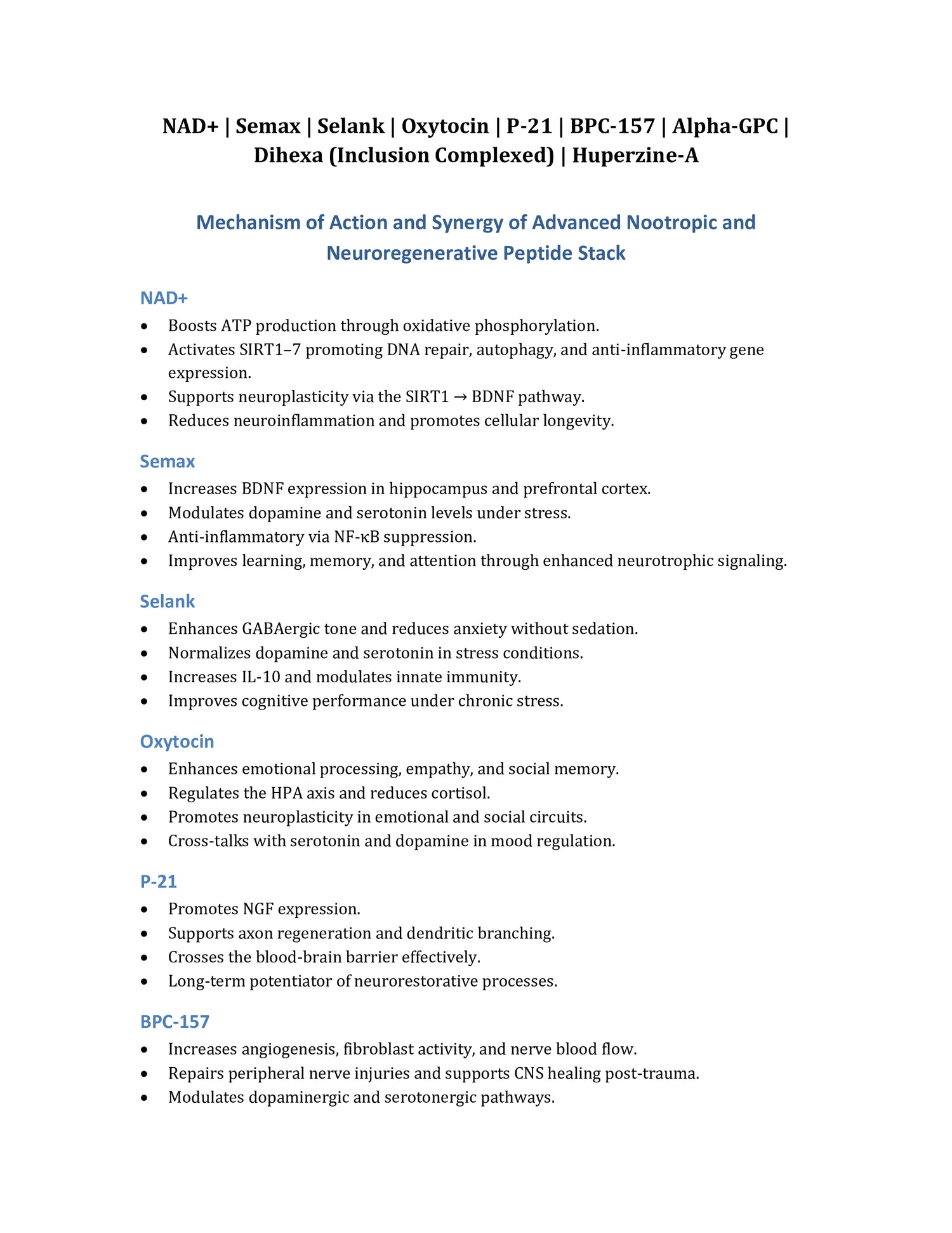 NAD+ | Semax | Selank | Oxytocin | P-21 | BPC-157 | Alpha-GPC | Dihexa (Inclusion Complexed) | Huperzine-A